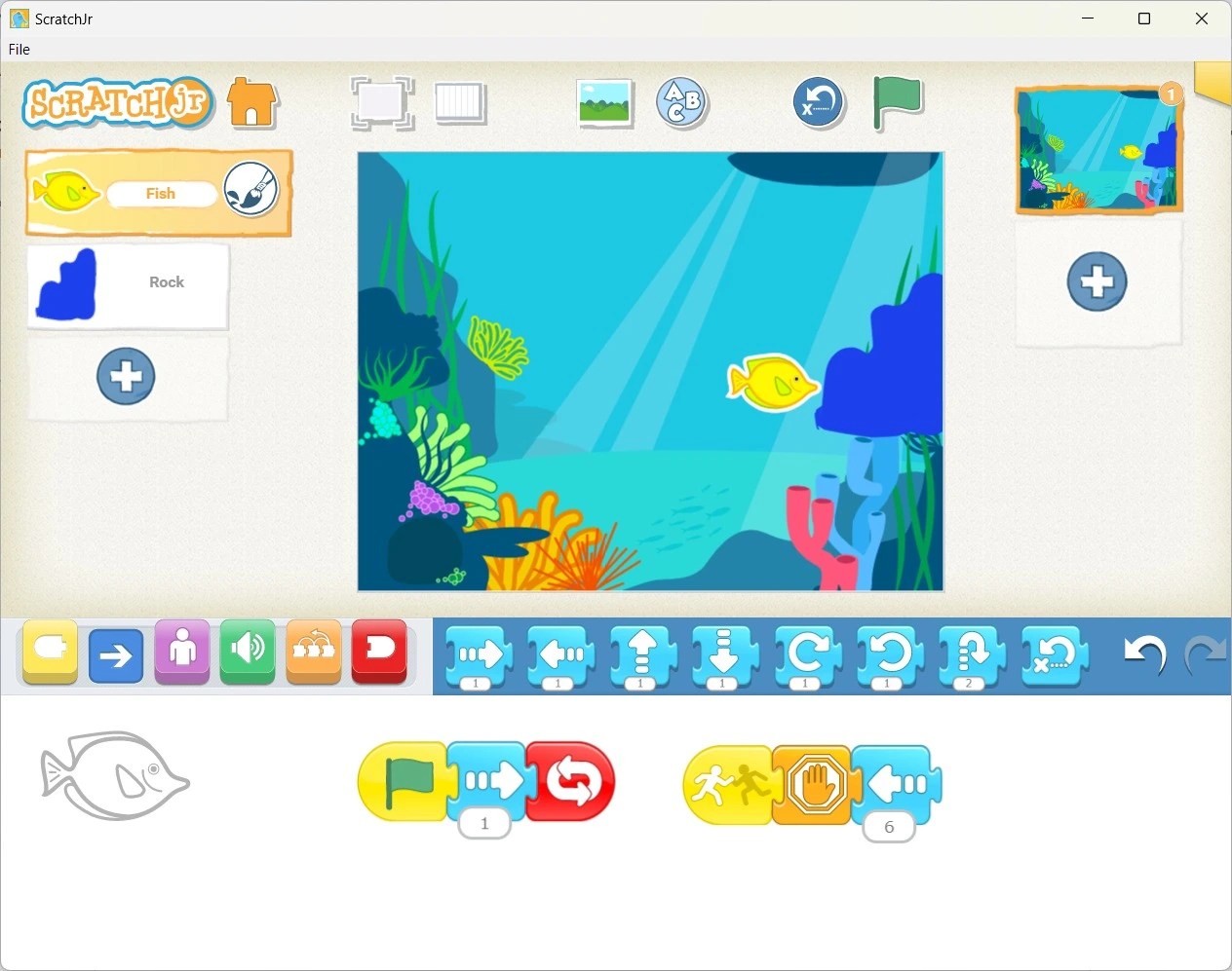 - Combine it with the “when bumped” block to reverse direction when the fish reaches the screen edge.
